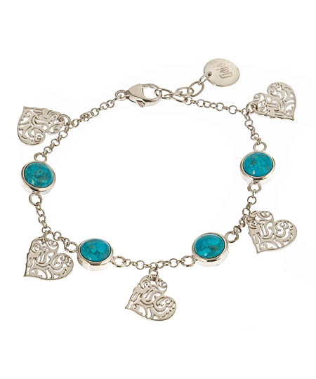This swirl heart turquoise bracelet by Gala is sure to be one of the sweetest pieces you’ve ever seen. Five cut out swirl hearts deck the sterling silver chain of the bracelet. In between each beautiful heart is a stunning turquoise stone resting in a circular shape on the piece.