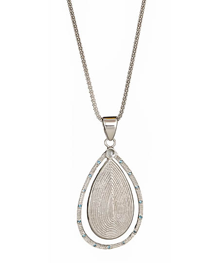 Create a stunning look with this teardrop necklace in sterling silver by Gala. The chain of this necklace is quite unique. Dangling from the end of the sterling silver chain is a gorgeous teardrop shaped pendant. The pendant features tiny blue topaz stones lining the outer rim of the piece.