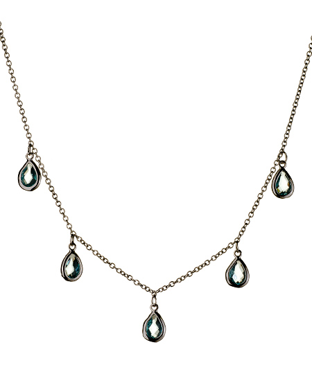 You'll love the aqua rain drop necklace from Genevive by CZC. The chain features five gorgeous tear drop shaped aqua colored cubic zirconia stones all beautifully bezel set in the silver necklace. This chain fastens with a lobster claw closure.