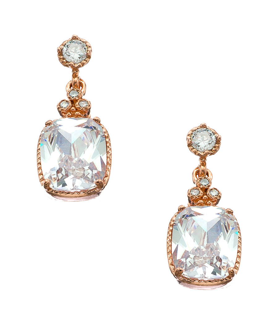 These sweetly feminine Genevive by CZC rose gold and CZ square drop earrings are timelessly elegant, heirloom worthy jewels. A gorgeous, large square CZ is accented with a cluster of smaller CZ accents and a small round CZ at the post closure for pierced ears.