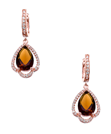 Stunning smoky topaz stones are showcased to their best advantage in these Genevive by CZC rose gold CZ and smoky topaz colored teardrop earrings. Teardrop shaped stones are prong set and complemented by an attractive outline of CZ stones. The arrangement hangs from a CZ lined horseshoe with a lever back closure for pierced ears.