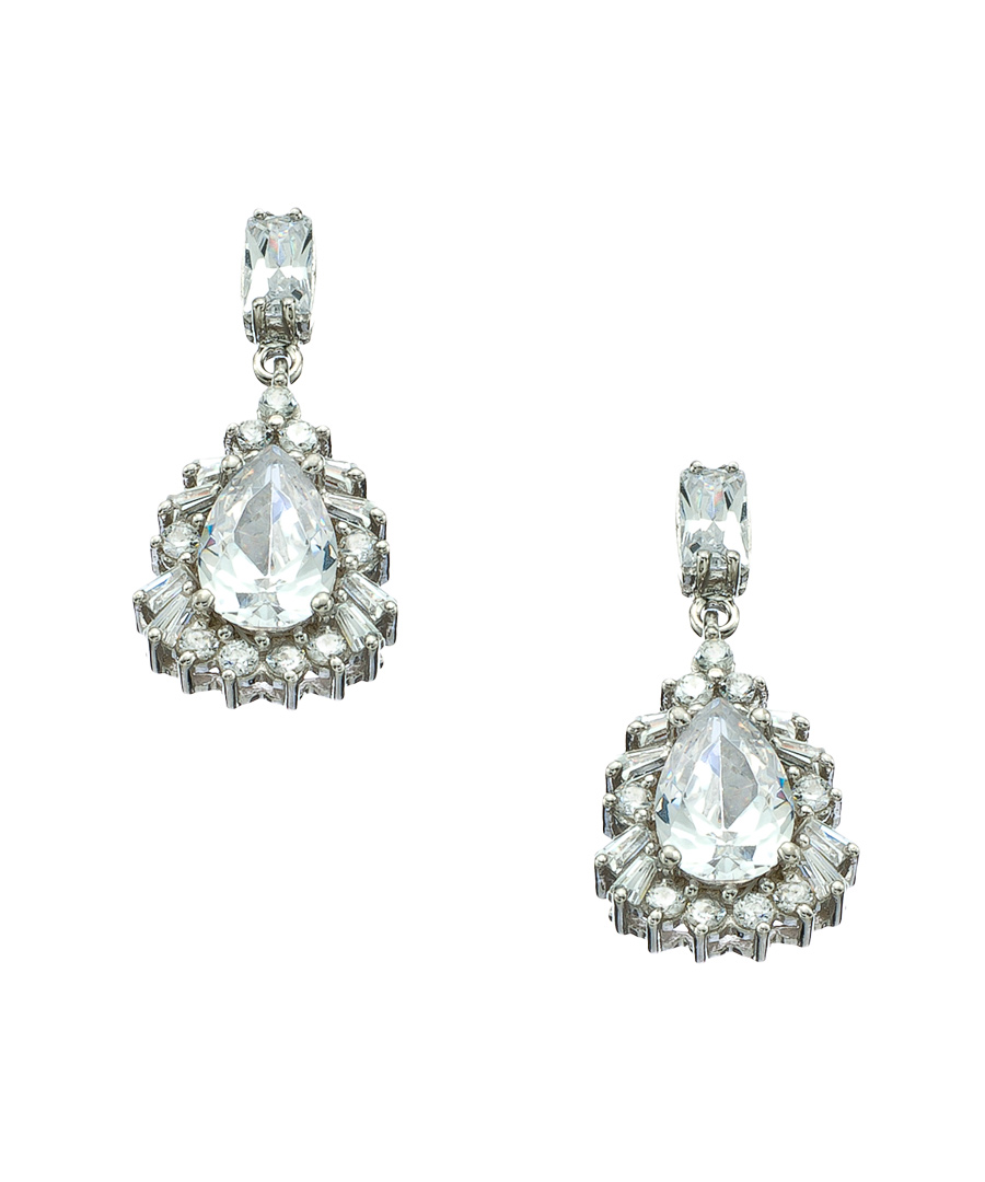 Elegant enough for your bridal ensemble, these gorgeous Genevive by CZC sterling silver and CZ pear shaped drop earrings deliver a fabulous look. Featuring a stunning large pear shaped stone showcased by smaller rounds and anchored by a slime baguette stones, you’ll feel like a star in these lovely crystal drop earrings, which fasten with a post closure for pierced ears.