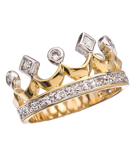 Kings and queens have always adored their bling and so can you with this gold and diamond CZ crown ring. The gold band is regally adorned with alternating round and princess cut cubic zirconias. This noteworthy ring is absolutely darling.