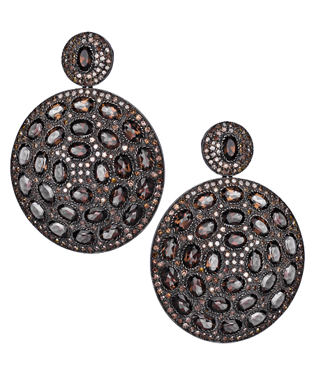 Step out in grand style with these diamond smoky topaz disk drop earrings from Hari Jewels. Oval cut stones are placed in a circular pattern all throughout the bottom disk. The earrings fasten with post back closures for pierced ears.