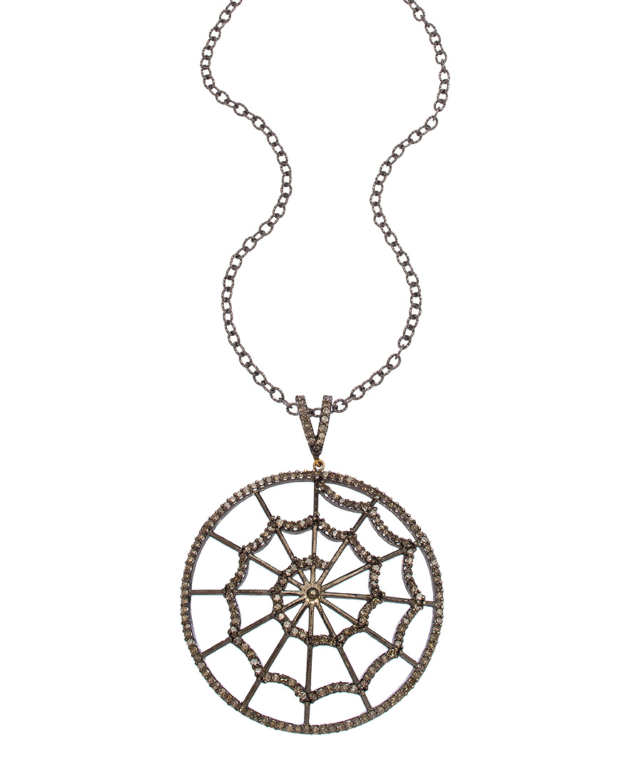 Dabble into something new. The Jala web necklace isn't your ordinary pendant. This necklace by Haridra has outstanding shine with its numerous diamonds precisely placed all over. The web is a perfect circle of diamonds with a diamond studded swirl on the inside. Wear this necklace in your own special way. It surely won't disappoint.