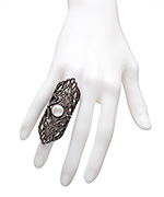 The Spader ring by Haridra will sweep you off your feet. The sparkling swirls are adorned in exquisitely placed diamonds. The pearl in the center even has a ring of diamonds around it. The radiance in this ring bounces off walls.