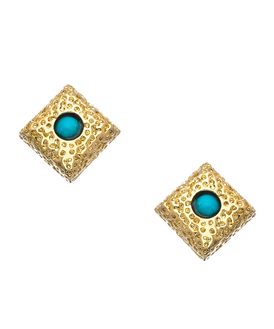 With beautiful turquoise stones in squares of raised, textured gold - these bespoke Harrison Morgan gold and turquoise cube stud earrings are going to quickly become your favorites. The gorgeous earrings are a study in contrast of both texture and color. Earrings fasten with a comfort post closure for pierced ears.