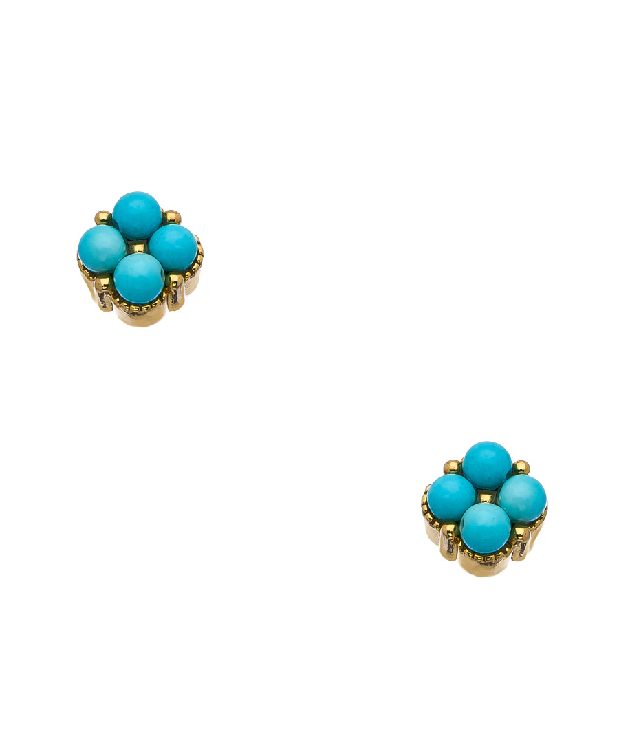 Four tiny turquoise stones collaborate to form these lovely Harrison Morgan gold and turquoise stud earrings. Feminine and diminutive, these exquisitely crafted studs are perfect for everyday. Earrings fasten with a comfort post closure for pierced ears.