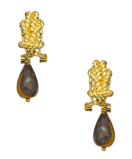 Tie a bundle of style to your ears with these exquisite tiger eye rope knot earrings from Harrison Morgan. The design of the earrings is what sets them apart as a gold plated rope is tied into a double bowline knot with an ancient tiger eye gemstone dangling beneath. You can pretty much pair these with anything from casual to dressy.