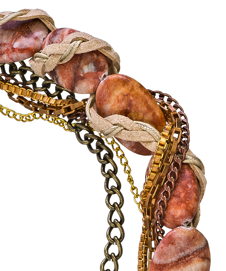 How can you resist this cream beautiful jasper twist bracelet from Holy Harlot? The attractive design is a well thought out melange of numerous interesting elements. The style includes braided leather, metallic cord and assorted chains and beads. This bracelet fastens with a lobster claw closure.