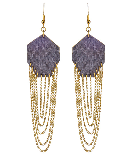 Create a sexy smoldering look with these gray gem earrings from Holy Harlot. The cascading micro curb chains dangle from the gray snake skin material with style. These earrings fasten with a French wire back for pierced ears.