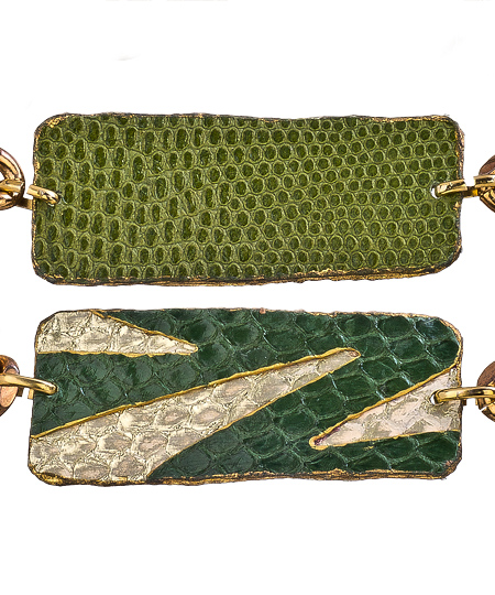 Don't miss out on this exceptional green Balenciaga's inlay I.D. necklace from Holy Harlot. The curb chain anchors a hand cut I.D. plate of inlayed exotic skins. The edge is finished in a gold leaf and the tag is leather backed. The chain fastens with a hook and eye closure.