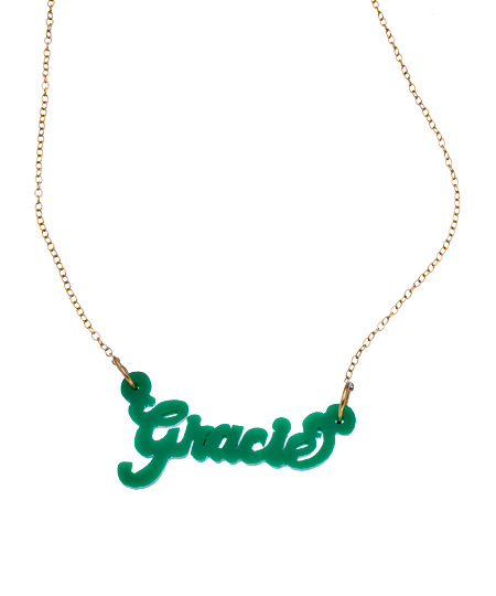 Claim your identity by claiming this hunter green acrylic nameplate necklace. Your distinctive name has never looked more lovely! Hand cut so no two are alike, select your choice of 10 letters or less. The pendant hangs from either a 16 or 18-inch sterling silver, rose gold or gold vermeil split chain.