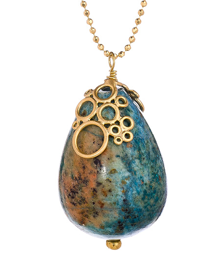Fun with bubbles isn't just for children; we adults can also enjoy them with jewelry like this bubble bead cap stone drop necklace from Indulgems. The modest chain comes alive with a magnificent pear shaped turquoise stone. The stone is capped by 18 karat gold metal which has been formed into varying sizes of circular bubbles. Lobster claw closure.