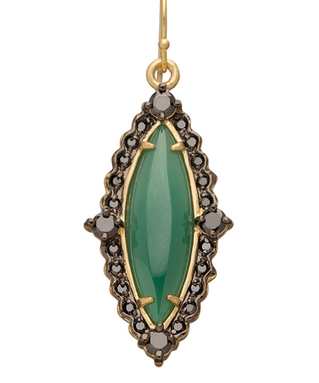 The green onyx marquise earrings by Indulgems have an antique design with a refined taste that's perfect for today's modern world. Two polished green onyx stones have an elegant marquise shape that's framed by black cubic zirconias. The 18k yellow-gold plate ear wires are for pierced ears.