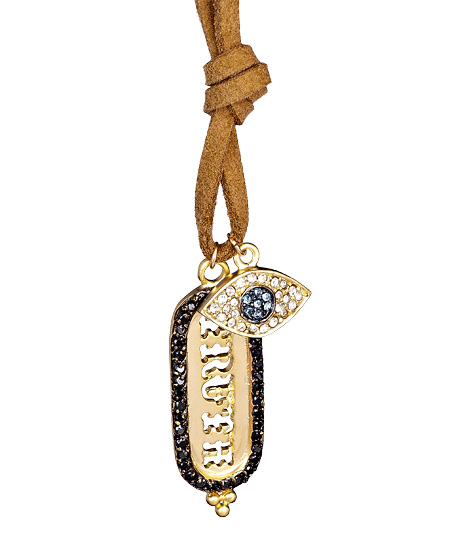 Show off your appreciation for honesty and truth with this truth ID tag and eye necklace from Indulgems. The gold plated tag is surrounded by black cubic zirconia along the edge and paired with an accompanying eye pendant which is also paved with luminous cubic zirconias. The faux suede cord lends a slightly rugged feel to this glitzy piece.