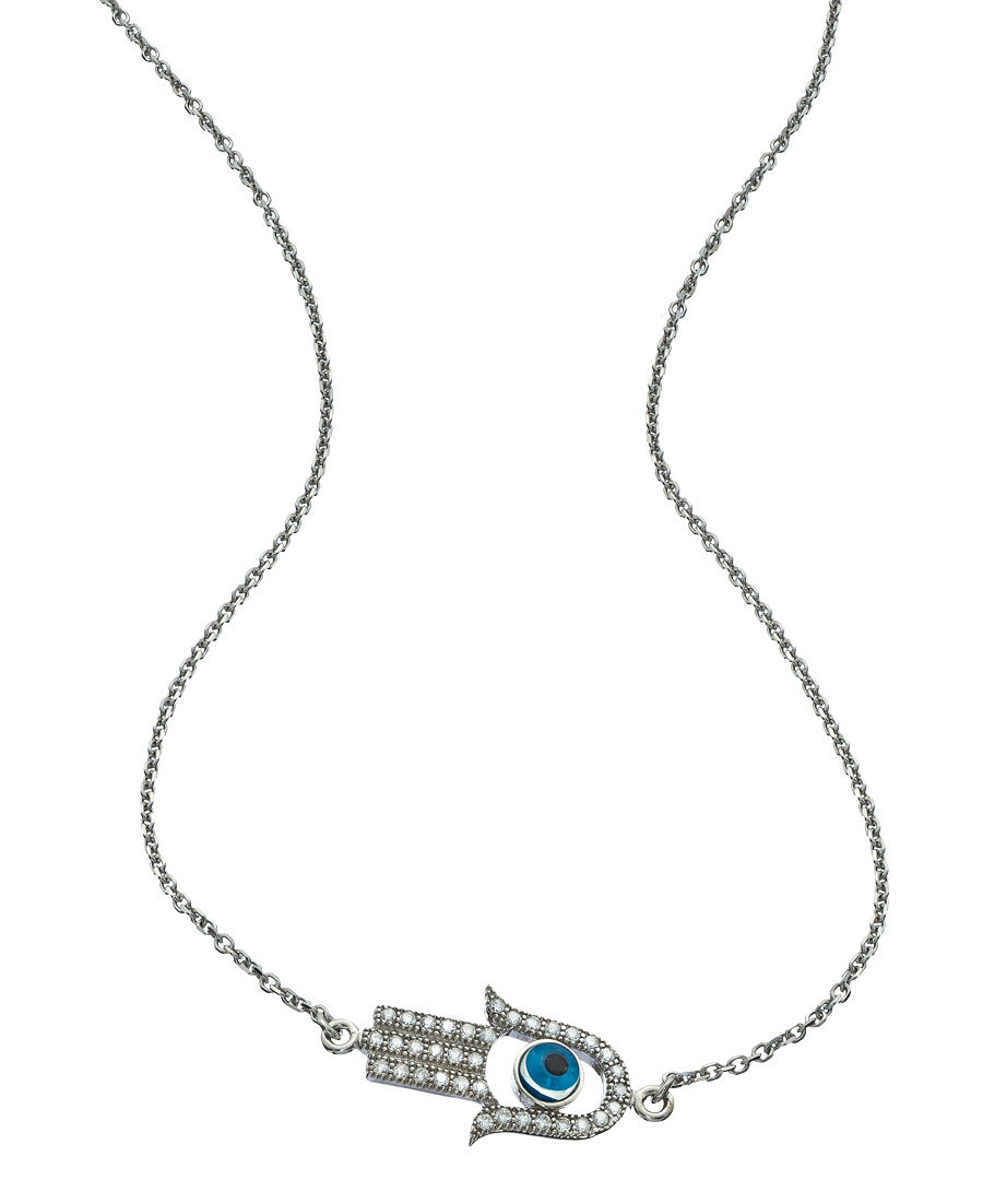 You’ll love this J Weber silver and crystal protector pendant necklace. The exquisitely designed hamsa symbol and evil eye provide a double serving of artistically crafted protection. Necklace fastens with a lobster claw clasp.