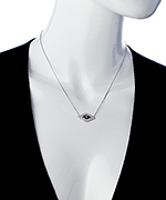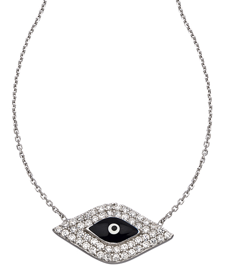 J Weber's silver, enamel and crystal eye pendant necklace is a beautiful way to find your Zen... with its mesmerizing enamel eye surrounded by sparkling crystals. Wear this necklace alone, or layer it with others for a stunning look. However you choose to wear it, be prepared to offer your most gracious "Thank yous," for the numerous compliments you're sure to receive. Necklace fastens with a spring clasp.