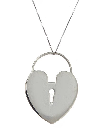 J Weber silver heart padlock necklace is simply irresistible. Crafted with sterling silver, this stunning heart-shaped padlock pendant is the perfect accessory for everyday wear. The pendant has a keyhole cut out from its center, and measures 1 1/4 inches long as it dangles from a magnificent 16 inch long matching chain. Necklace fastens with a spring ring clasp.