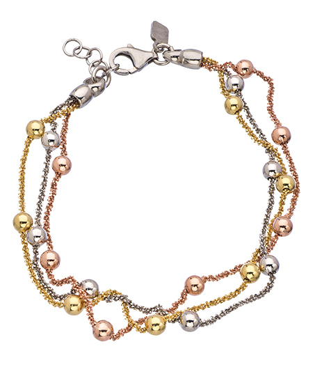 If you love mixed metals, good news: your favorite three metals coexist harmoniously, in this J Weber silver, rose gold and yellow gold tricolor bracelet. Strands of each metal are twisted and further enhanced with beads of the same color. Bracelet fastens with a lobster claw clasp.