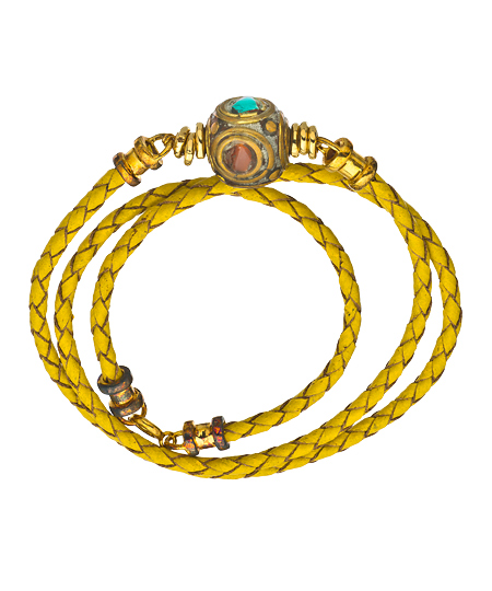 Jacqueline Pinto's braided yellow leather wrap bracelet with brass, turquoise and coral is exquisite in every detail. From the rich color to the fine craftsmanship, this is a bracelet you'll want to wear with everything. Its length also makes it work as a necklace. Bracelet features a gold spring clasp closure.