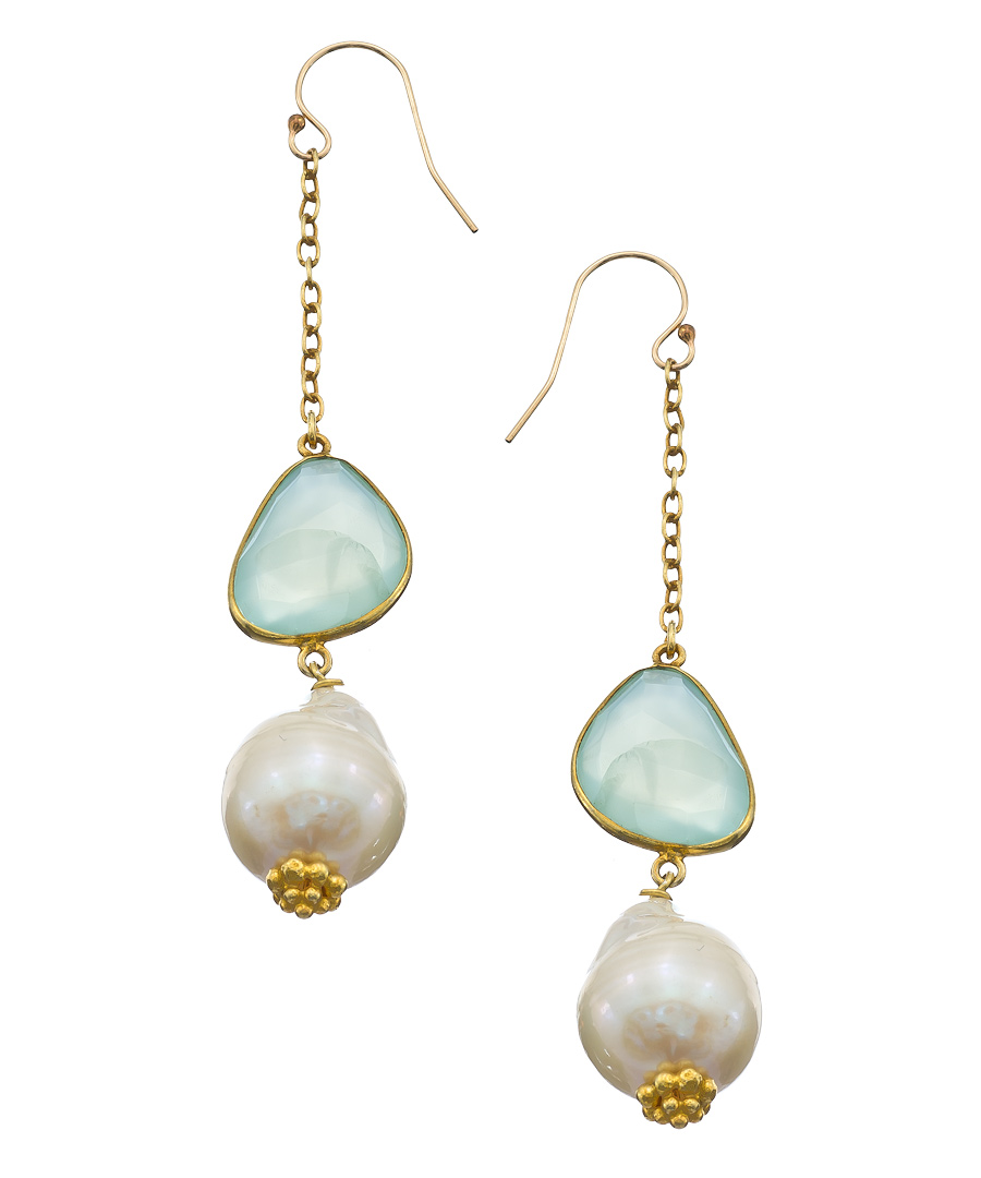Capture your love for brilliance with the never-ending sparkle from these glamorous chalcedony earrings from Jacqueline Pinto. The sea green gemstones, gold baroque pearls, and alluring design offer a new take on your fetching style. Slip on bold essence.