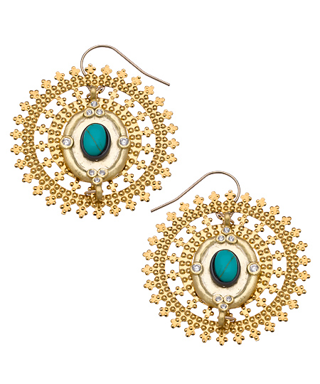 These gorgeous gold round turquoise enamel earrings from Jacqueline Pinto make an elegant statement.