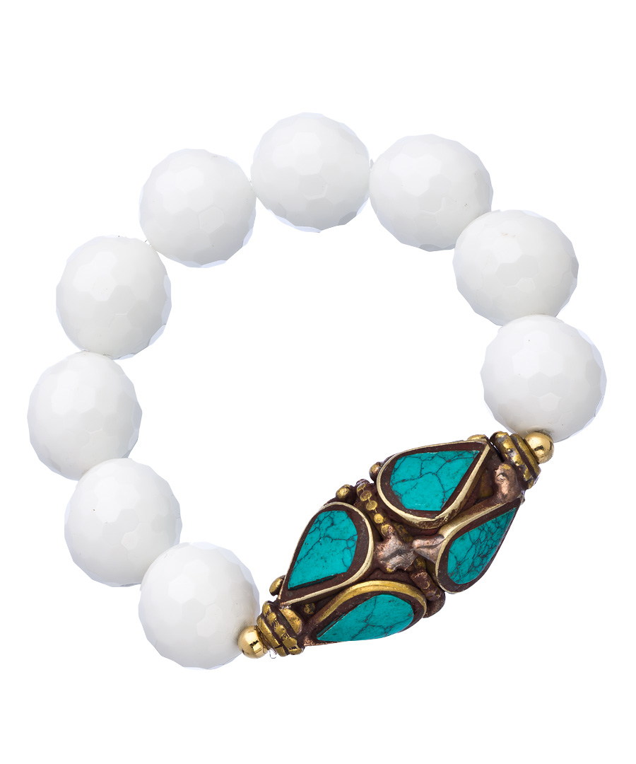 this bold white jade bracelet from Jacqueline Pinto. Large faceted agate beads highlight a turquoise accented ornament that is sure to get you noticed. Wear it proud.