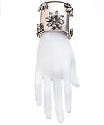 This Janis by Janis Savitt antique silver and crystal cuff bracelet is an heirloom worthy creation of unparalleled elegance. Featuring crystal flowers adorning the large, rolled-rim cuff, the wide bracelet pairs well with a myriad of your favorite wardrobe options, delivering a powerful and beautiful finishing touch every time.