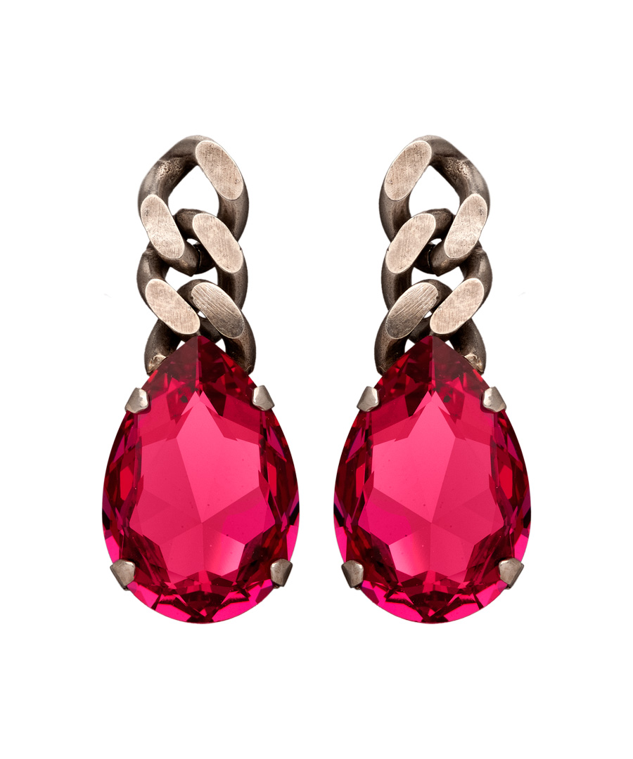 The antiqued chain and pink crystal earrings are one part girly and one part edgy. Two gleaming pink Swarovski crystal teardrops hang at the bottom of the antiqued silver plate chains for an unexpected pop of color. The post backs are designed for pierced ears.