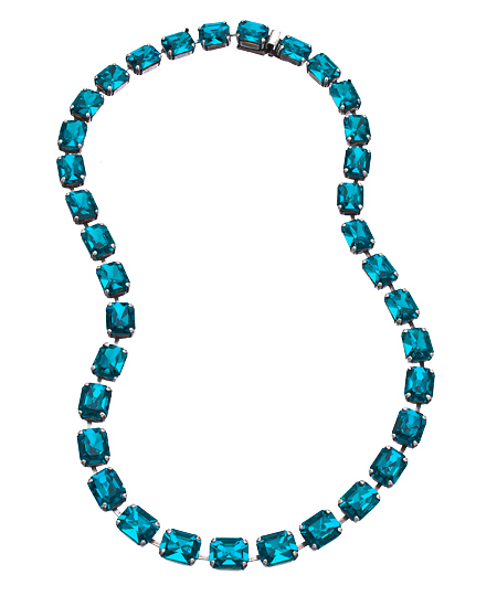 An exuberant expression of color and elegance, the aqua crystal necklace from Janis by Janis Savitt is beautifully crafted. It features a strand of square cut teal Swarovski crystals set in silver. This necklace will light up any outfit.