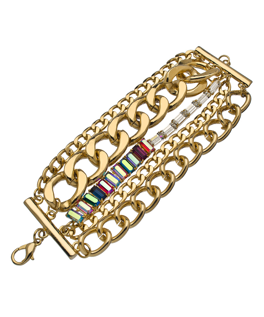 This oversized crystal multi link chain bracelet from Janis by Janis Savitt offers you a bold couture look. The color illuminates your wardrobe with brilliant Swarovski crystals. Slip it on with even the simplest of outfits and get ready to get noticed!