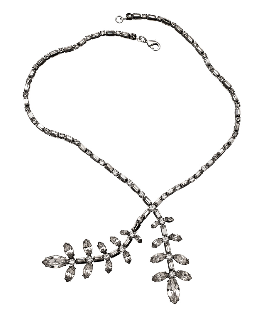 The Janis by Janis Savitt twisted leaf pendant necklace has a sophisticated Art Deco-inspired silhouette. The leaf details at the end of the faux-lariat design are dripping with Swarovski crystals for an enchanting effect. This timeless piece will transcend the seasons.
