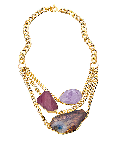 Trust: this Janna Conner Designs gold, amethyst and agate three strand bib necklace is the only way you ever want to be 'stranded!' Gorgeous stones with hues of purple, burgundy and blue are bezel set in gleaming gold and attractively arranged on the three strands (and two sizes) of gold curb chain. Necklace fastens with a toggle clasp.