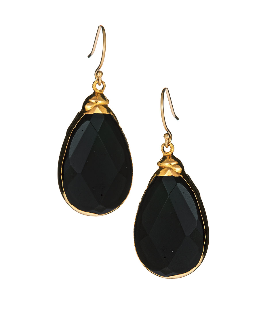 Janna Conner Designs' gold and onyx teardrop sarotte earrings provide both casual comfort and classy elegance. Faceted teardrop semi-precious onyx stones hang 1 inch to compliment any outfit. Hanging from a gold-plated wire, the pear-shaped stones are accented with gold-plated sides. A simple beautiful pair.
