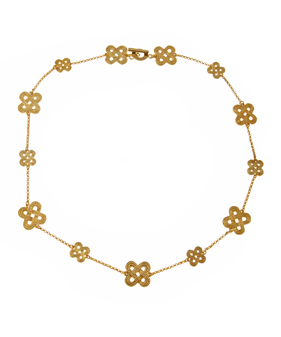 Janna Conner Designs gold crisscross necklace is stylish and chic. Radiant yellow gold plated crisscrossed pendants are placed along the length of this gorgeous yellow gold plated rolo chain. The pendants alternate between 1/2 inch wide and 3/4 inch wide for an interesting look. In total, this necklace measures 24 inches long, making it perfect for layering with other necklaces for a trendy look. Necklace fastens with a toggle clasp.