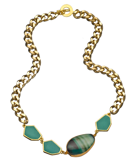 Gleaming gold curb chain sets the stage for this Janna Conner Designs gold, emerald and striped agate Ivana necklace. The stars of the show are three emerald colored enamel stones and a larger, striped agate stone. Necklace fastens with a toggle clasp closure.