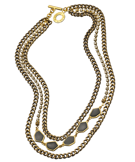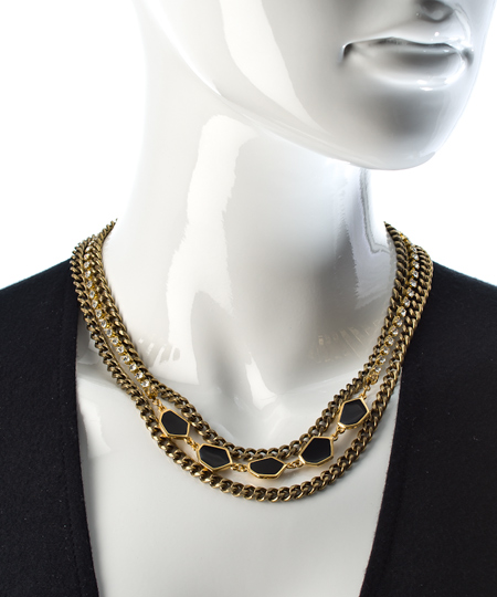 Sleek and sophisticated black enamel stones are attractively bezel set and placed on a chain of sparkling clear crystals, joined by two antique gold chains in this Janna Conner Designs gold, jet and crystal Malia necklace. Add a touch of elegance to your outfit with this charming necklace, which features a toggle clasp closure.