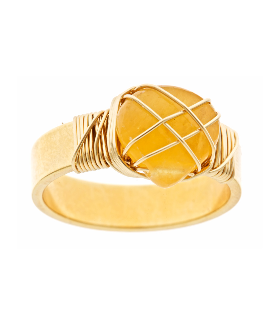 Janna Conner Designs honey jade ring is beautiful. A faceted honey jade stone has a fabulous yellow color as it sits atop your finger. The stone is wire wrapped to the yellow gold plated band with 14k gold filled wire. Measuring 3/8 inches wide on your finger, this ring is sure to dazzle. Available in whole sizes 6-8.