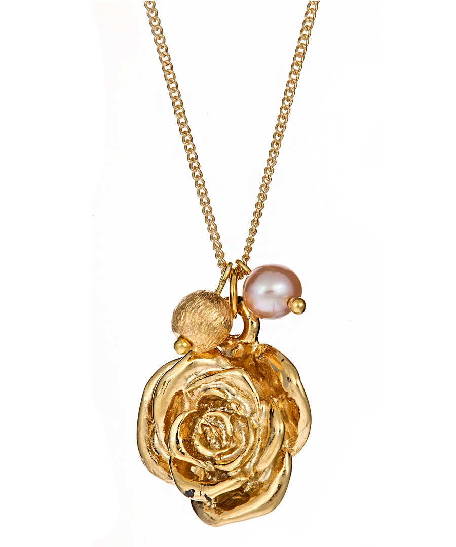 Janna Conner Designs rose pendant necklace is wonderfully feminine. A small rose pendant that has a 3-dimensional design and intricate detailing dangles from your neck along with a vermeil bead and a small pink pearl. Hanging 3/4 inch long, the pendant is strung on an 18 inch long 14k gold filled chain. Necklace fastens with a spring ring clasp.