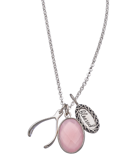 your stash of lucky baubles. Crafted out of sterling silver, this perfect piece includes an oval charm that reads, 'blessed', a little wishbone, and a pretty pink gemstone to bring a