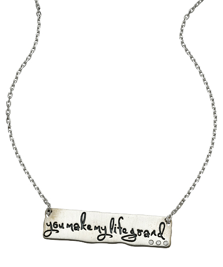The 'You Make My Life Grand' necklace from Jenny Present is the gift you give to someone special, just because. This pretty keepsake necklace is crafted with a sterling silver phrase tag which hangs from a delicate sterling silver cable chain. Make someone's day and give this lovely accessory as a gift out of the blue.