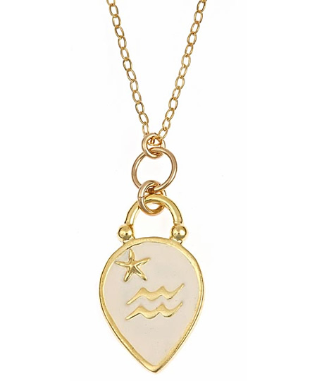 Jessica Elliot Aquarius enamel zodiac pendant is a great for yourself or for a gift. Zodiac sign on the front with a star in a different place, and on the back it has the name of the zodiac engraved. Enamel is in the color determined by the corresponding element (Water signs: Turquoise, Earth signs: Green, Fire Signs: Red, Air signs: Cream). Adjustable sparkle chain is 16-19" long. Try layering two at different lengths with your sign, and the sign for your husband, boyfriend or kids. Pendants come with a card describing attributes of that sign and element.