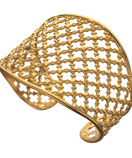 Jessica Elliot Gold Vermeil Wrought Iron Cuff is stunning. Worn as an everyday piece or for a formal event, this cuff is glamorous and captivating. The pattern is of small clover cut-outs. The cuff is adjustable and bends to fit the wrist. 18k vermeil.