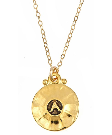Jessica Elliot vermeil initial disc necklace is unlike anything you've seen before. The disc is crafted of gold vermeil and has a small circled letter in the middle. Only the 15 most popular letters are available: A, B, C, D, E, H, K, L, M, N, R, S, and T. Pendant hangs from a chain that is adjustable between 16 and 19 inches.