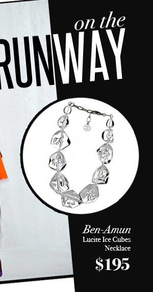 Ben-Amun Lucite Cubes Necklace was worn on the runway in the Joy Cioci SS12 show this Mercedes-Benz Fashion Week. The model looked Ravishing in her bright orange dress and lips with purple shoes. Clear color Lucite jewelry will go with virtually everything in your wardrobe. We really enjoyed the Joy Cioci collection with all the great colors and amazing fabrics. We always believe that the right jewelry ties the entire look together and loved the Ben-Amun Lucite Cubes Necklace worn in the Joy Cioci show.
