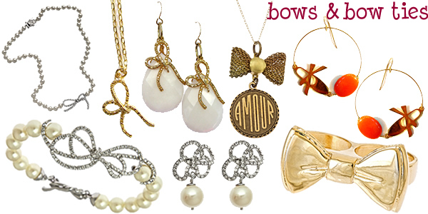 Items featured in picture: Jami Rodriguez Gold and White Agate Bowtie Earrings, Jami Rodriguez Gold Bowtie Necklace, Jami Rodriguez Orange Bowtie Ballerina Hoop Earrings, Erica Anenberg Bow Double Ring, Archive Design Brass “Amour” Charm Necklace, Carolee Crystal Bow with Pearl Earrings, Zaria Bow on a Strand of Pearls Necklace and Carolee Crystal Bow on a Pearl Bracelet.