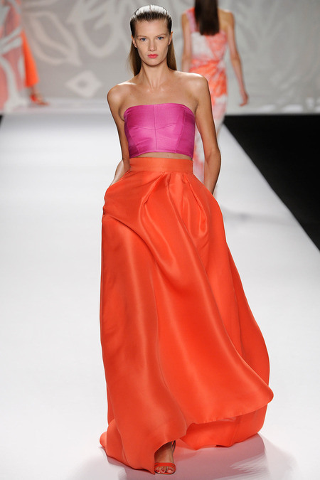 The orange skirt with the hot pink crop top by Monique Lhuillier is a good starting point when you are deciding how to style your full length. It’s a colorful look that will be perfect for a lunch date with your girlfriends. You can add a fun bib necklace to accessorize this look. We recommend the Carolee Crystal Geometric Station Necklace. It is bold without overshadowing the look.