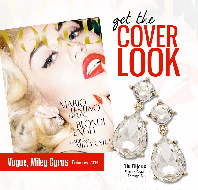 When most people think of Miley Cyrus, they think of the notorious good girl gone bad who taught us how to twerk. It’s already been a couple of years since Cyrus ditched the blonde Hannah Montana Wig and pretty much all of her clothes to create an entirely new persona. Well, despite all the hate that Miss Cyrus has received since her transformation, she has actually brought some serious fashion trends to the forefront and made quite a name for herself. In her most recent gig, Cyrus dazzles in a Marilyn Monroe style photo shoot on the cover of German Vogue magazine. Although she is nude throughout most of the issue, the cover is a close-up shot of Cyrus adorned with a stunning pair of drop earrings that remind us of the Blu Bijoux Fantasy Crystal Earrings. It’s a great look for her, and it seems that after months of displaying more of an edgy side, Cyrus may be ready for another change.