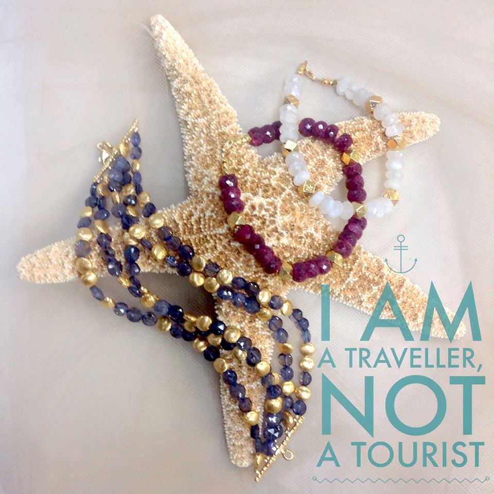 The Catherine Weitzman Gold and Iolite Five Strand Mixed Coin Bracelet combines both gold and iolite to produce this bold piece which will be perfect for a night of dinner, drinks and dancing on your trip. During the day, you can mix and match the Catherine Weitzman Gold and Ruby Wide Stripe Bracelet and the Catherine Weitzman Gold and Moonstone Wide Stripe Bracelet with your big floppy beach hat and over-sized bag for a day of shopping.